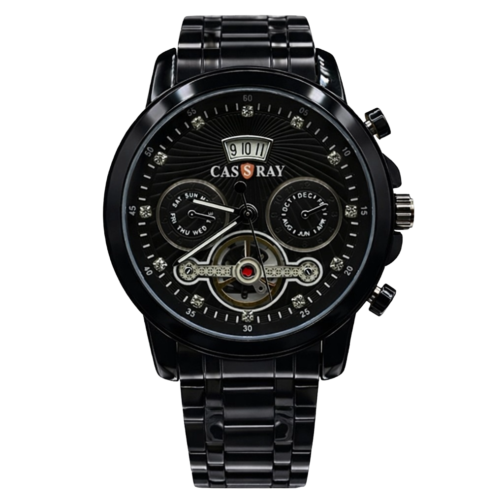 Casray Men’s Gold Multi-Function Watch – Black Dial with Exposed Gears & Crystal Markers